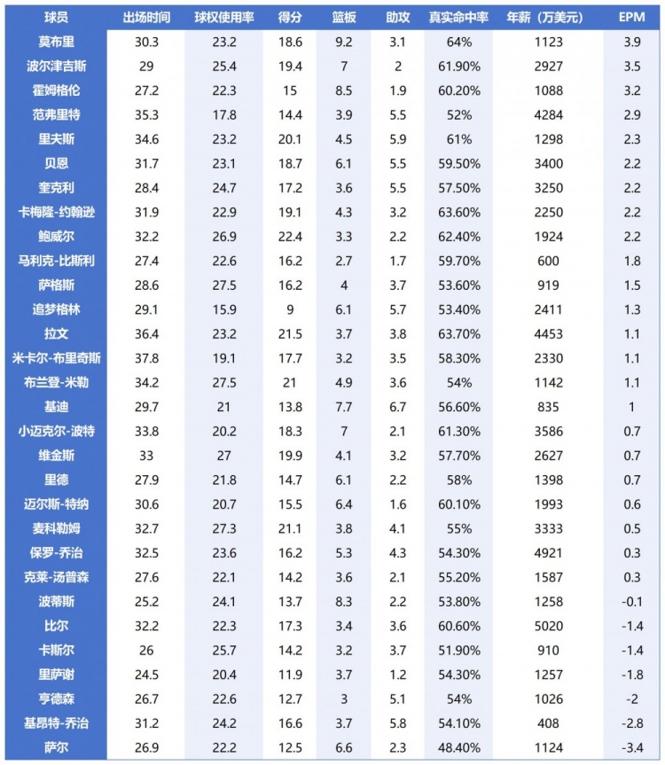 论综合影响力,具备超强防守影响力的高大内线优势巨大。30位三当家EPM排行榜,莫布里、波尔津吉斯和霍姆格伦分列1-3位,他们所效力的球队均是本赛季胜率前3位的强队。考虑到他们3人攻防兼备,这个结果不让人意外。