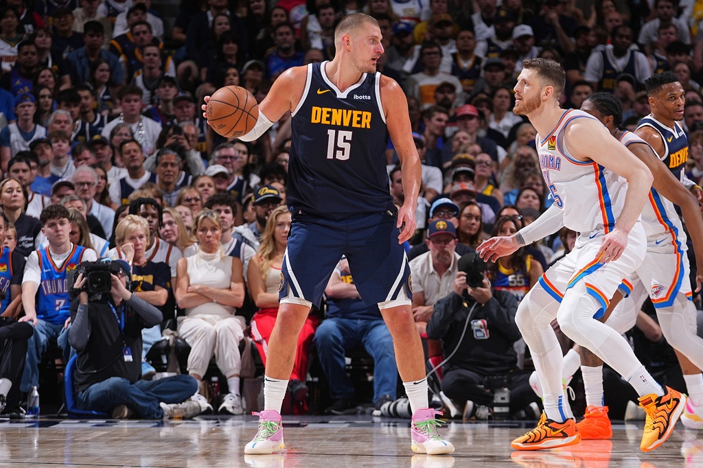 雷霆继续用哈滕/杰林-威廉姆斯轮番当肉盾扛约老师,结合小个夹击,不让约老师篮下一打一。哈滕、杰林-威廉姆斯、霍姆格伦也确实无法单防约老师,因此低位夹击约老师逼他出球,考验掘金外线三分球,直接在系列赛这五场都请掘金开卷答题。