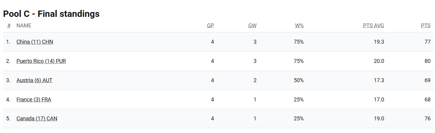 注:3V3排名规则先看胜场,再看交手战绩,再看总分,本场比赛法国只要赢球,同组波多黎各3胜1负排名第一,中国法国奥地利三队战绩相同都为2胜2负,奥地利和法国均赢了中国,中国由于交手劣势,无论如何都会排在小组第四遭到淘汰。法国和奥地利则是会携手进入附加赛。