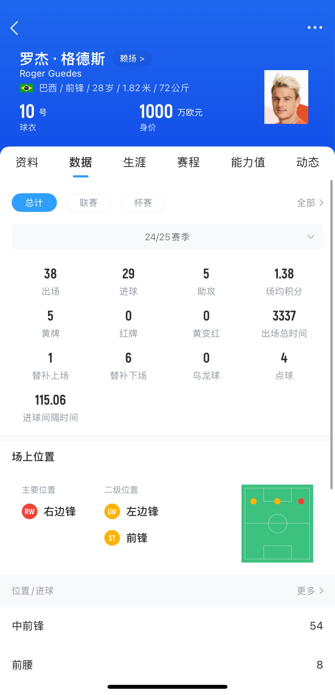 目前格德斯的德转身价为1000万欧,他与赖扬的合同2027年到期。