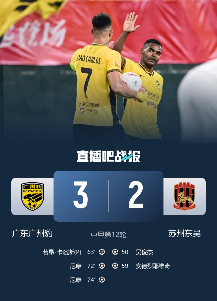 第74分钟,广州豹反超比分,尼康远射破门梅开二度,广州豹3-2领先苏州东吴。↓