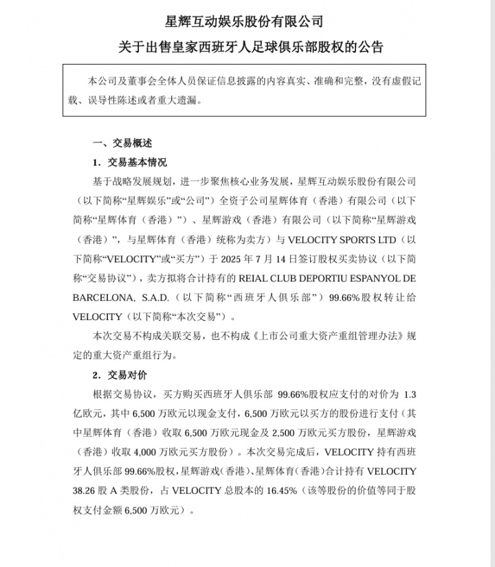 根据交易协议,买方购买西班牙人俱乐部99.66%股权应支付的对价为1.3亿欧元,其中6500万欧元以现金支付,6500万欧元以买方的股份进行支付(其中星辉体育收取6500万欧元现金及2500万欧元买方股份,星辉游戏收取4000万欧元买方股份)。本次交易完成后,VELOCITY持有西班牙人俱乐部99.66%股权,星辉游戏、星辉体育合计持有VELOCITY38.26股A类股份,占VELOCITY总股本的16.45%(该等股份的价值等同于股权支付金额6500万欧元)。