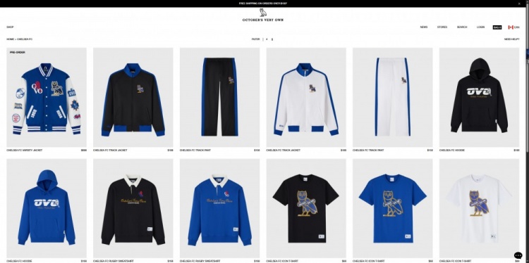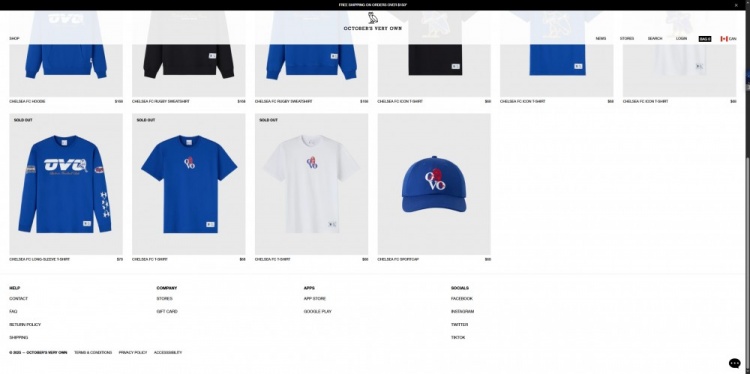 双方在Instagram上联合发布了合作公告,并在美国东部时间7月16日上午7点发售了印有OVO标志和切尔西队徽的联名服饰及配饰。