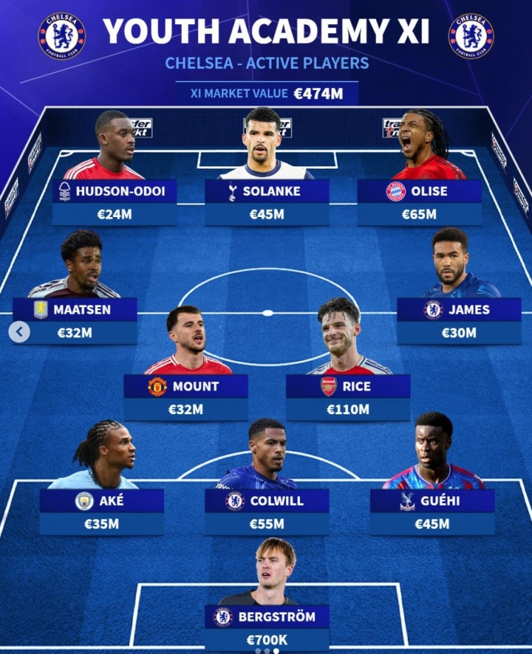 切尔西青训当前身价最贵阵:总身价4.74亿欧元