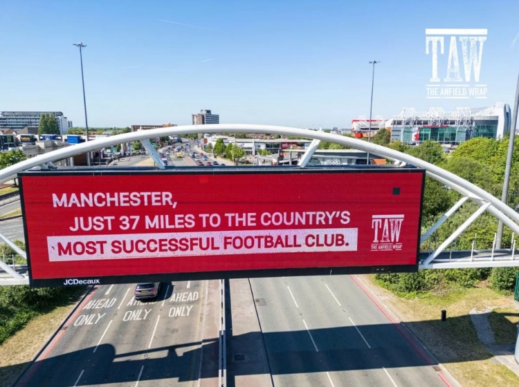 利物浦球迷打广告嘲讽曼联:曼彻斯特距英格兰最成功球队仅37英里