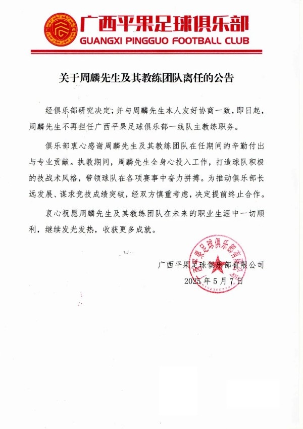 5月7日讯 中甲广西平果官方宣布,周麟及其教练团队离任。广西平果官方公告写道:经俱乐部研究决定,并与周麟先生本人友好协商一致,即日起...
