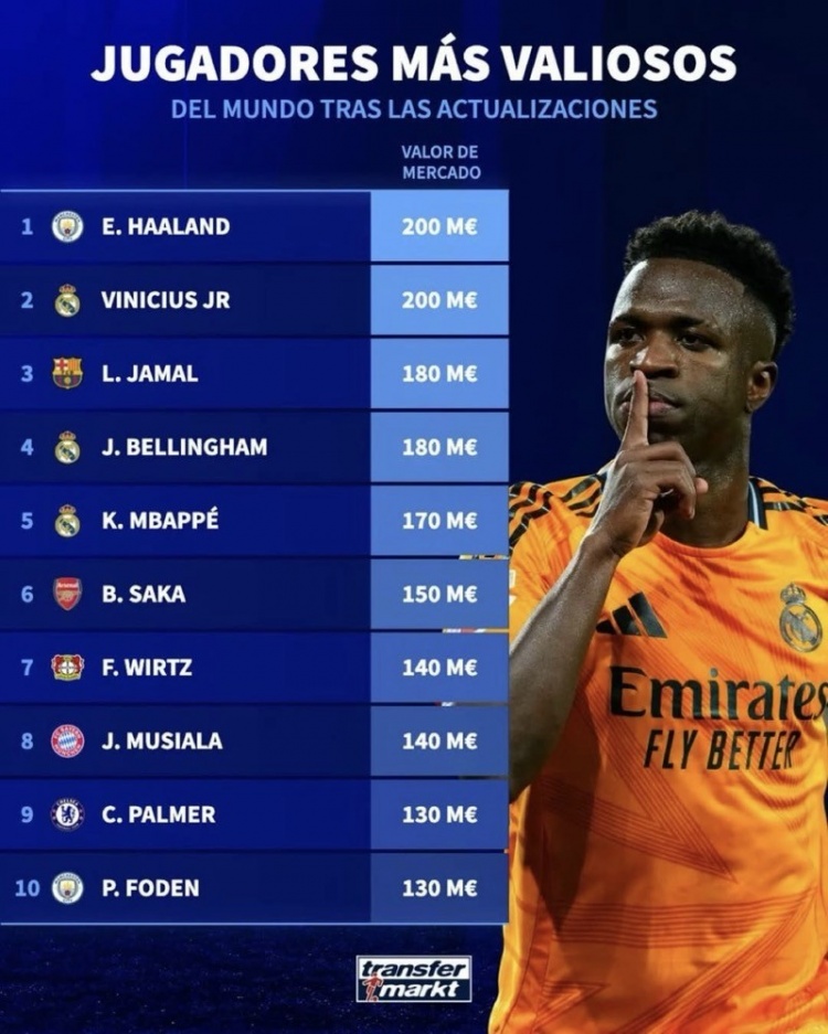 4月7日讯 德国转会市场列出世界足球员身价最高的前十名单,其中哈兰德和维尼修斯2亿欧居首,亚马尔和贝林厄姆1.8亿并列,姆巴佩1.7亿排名...