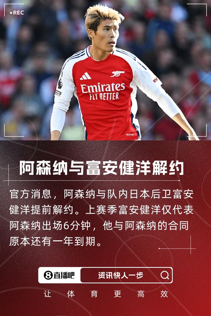 07月04日讯 官方消息,阿森纳与日本后卫富安健洋解约,他的合同原本将于2026年6月30日到期。富安健洋今年2月接受了手术,目前仍需休养5个...